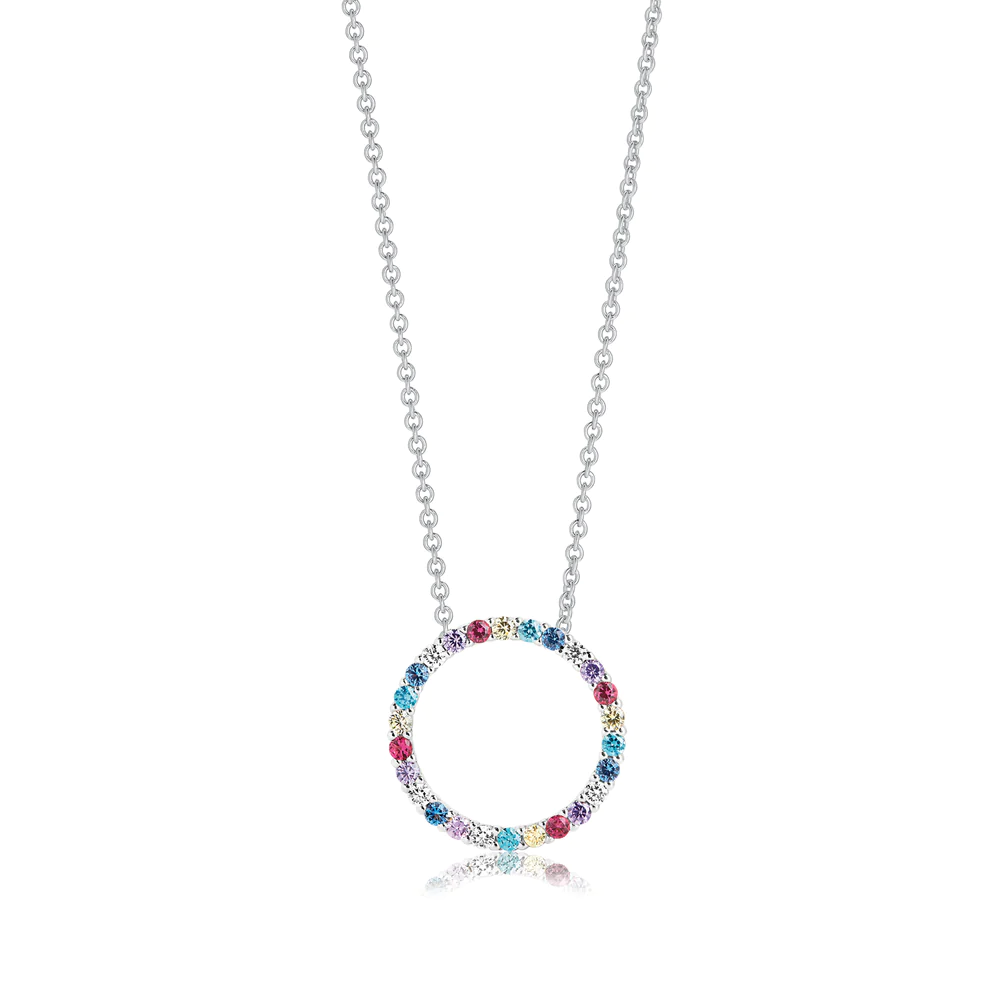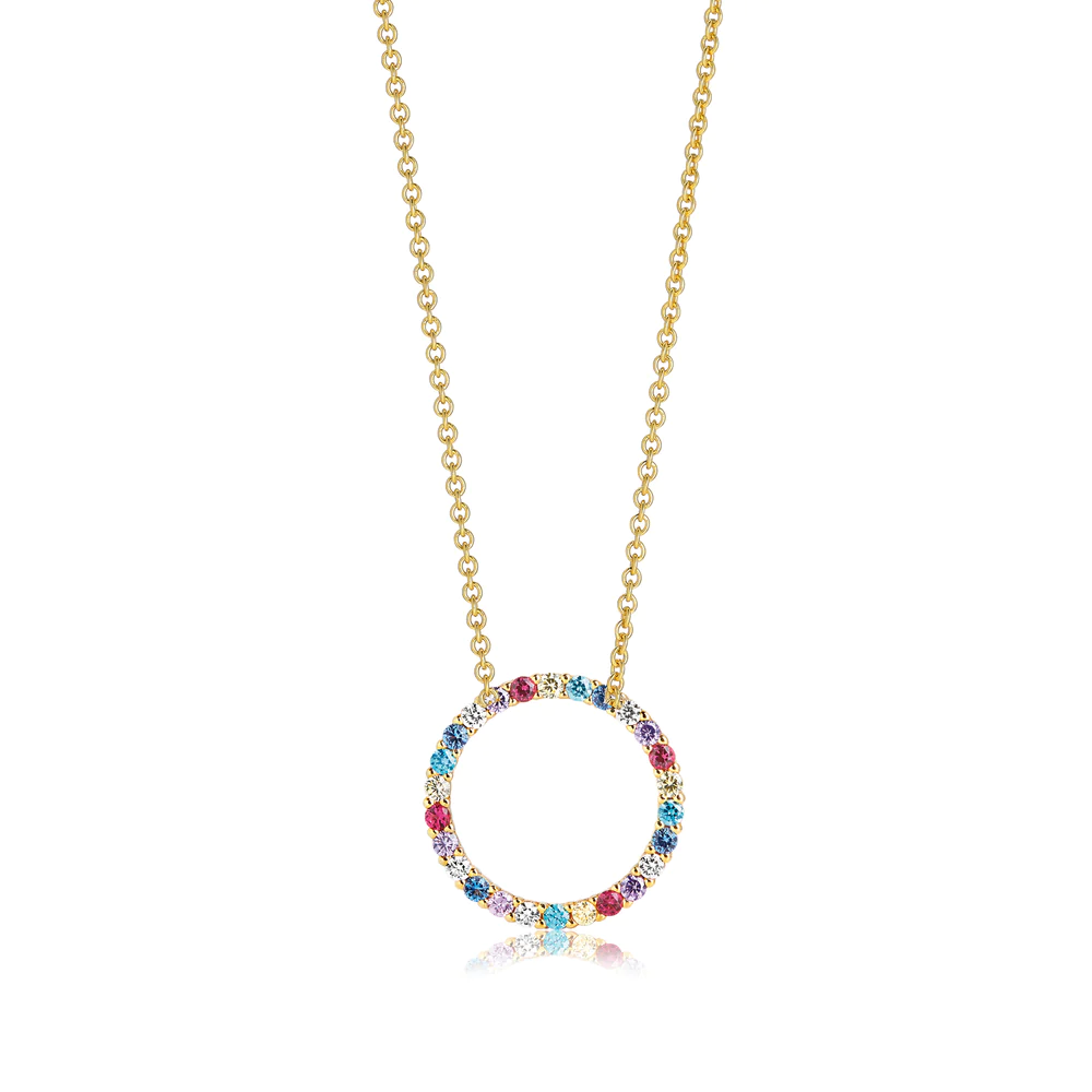 Denne Biella Pendant halskæde fra Sif Jakobs Jewellery er en fest for øjet med sit cirkulære vedhæng, der er elegant besat med en mangfoldighed af farverige zirkoner. Hver sten er nøje udvalgt for at skabe en levende og livlig palet, der reflekterer lys fra alle vinkler. Halskædens kæde er fremstillet i en gylden tone, hvilket antyder, at den er forgyldt, hvilket komplementerer de forskelligfarvede sten og tilfører et touch af varme til smykket. Dette stykke er en ode til farve og glæde og ville være et perfekt tilføjelse til enhver smykkesamling, tilbydende et pop af farve til både hverdags- og aftenoutfits.
