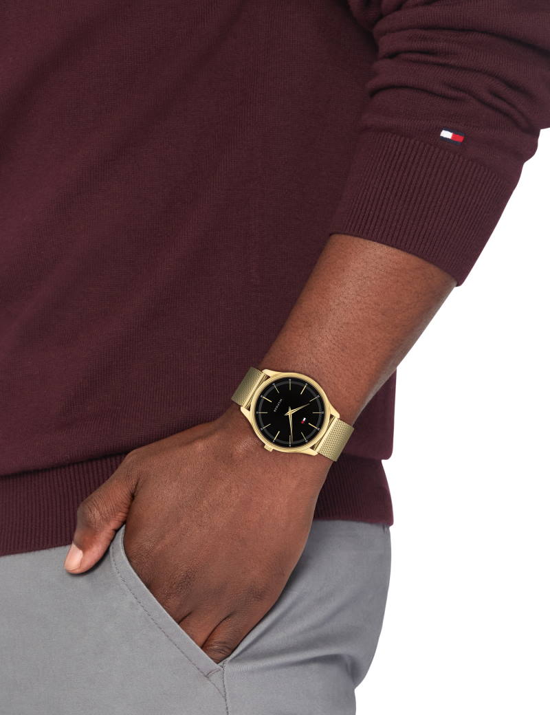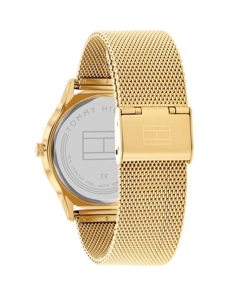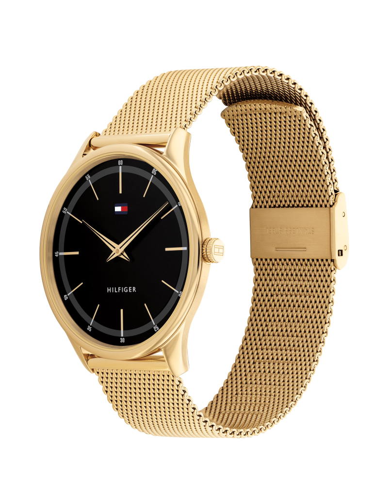 Dette elegante guldfarvet ur kombinerer tidløs charme med en moderne mesh-lænke. Den sorte skive giver en skarp kontrast, der fremhæver de gyldne timemarkeringer og visere. Det minimalistiske design suppleres af en lille farveakcent på skiven, hvilket tilfører et diskret præg af stil. Uret er ikke bare et stilfuldt valg, men også funktionelt med sin tydelige sekundviser og komfortable pasform.